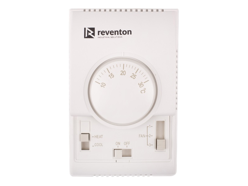 Regulator obrotów z termostatem steruje wentylatorem z 3-biegowym silnikiem. Wbudowany termostat pozwala osiągnąć i utrzymać daną temperaturę niezależnie od warunków za oknem. Dodatkowo regulator steruje pracą siłowników zainstalowanych na zaworze regulacyjnym. Pracuje w trybie grzania i chłodzenia.