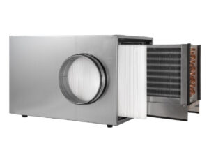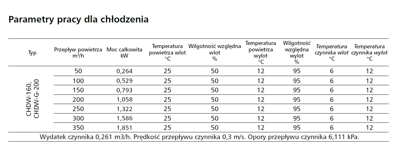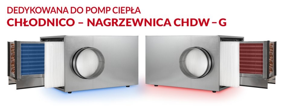 Chłodnico-nagrzewnica kanałowa CHDW-G przeznaczona jest do domowych systemów wentylacyjnych i umożliwia schładzanie powietrza nawiewanego do pomieszczeń w okresie letnim oraz dogrzewanie go w okresie zimowym. Urządzenie posiada obudowę wykonaną ze stali ocynkowanej izolowaną matą kauczukową grubości 24mm. Wewnątrz obudowy znajduje się 6-rzędowy wymiennik aluminiowy oraz zintegrowaną z nim aluminiową tacę skroplin. Konstrukcja przewiduje łatwy dostęp do wymiennika, który można wyjąć w celach konserwacyjnych lub zmienić stronę montażową (lewo/prawo). Wersja CHDW-G posiada filtr powietrza ISO Coarse 70% (klasa G4) o grubości 46mm od strony czerpni oraz przeznaczona jest do współpracy z glikolowymi gruntowymi wymiennikami ciepła (GGWC).
