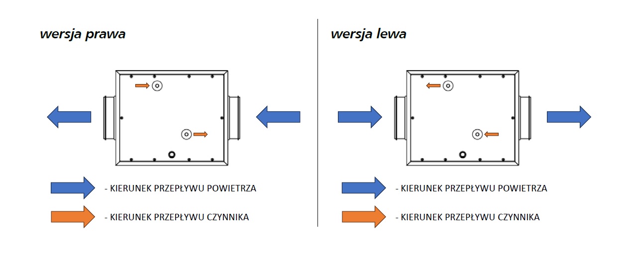 Chłodnico – nagrzewnica została wyposażona w sześciorzędowy blok chłodnicy glikolowej zakończony rurkami miedzianymi M18x1 z możliwością użycia złączki ½”. W celu zapewnienia optymalnej pracy wymiennika zasilanie czynnika należy podłączyć w przeciwprądzie z przepływającym powietrzem, zgodnie z poniższymi ilustracjami.