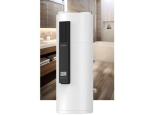 Pompa ciepła CWU Hyundai HHPM-M100WM z wbudowanym zbiornikiem wody 98 L, dodatkową grzałką elektryczną o mocy 1,5 kW oraz modułem WiFi do zdalnego sterowania.