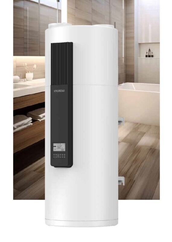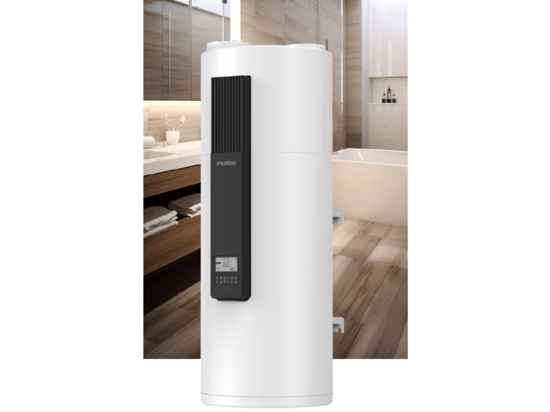 Pompa ciepła HYUNDAI C.W.U. to urządzenie przeznaczone do podgrzewania ciepłej wody użytkowej (CWU) do zastosowania i montażu wewnątrz budynku na ścianie, bez konieczności instalacji agregatu. Urządzenie w górnej części zostało wyposażone w układ termodynamiczny podgrzewający wodę (sprężarka, wymiennik ciepła oraz grzałka elektryczna o mocy 1,5 kW). Dolna część pompy została wyposażona w wysokiej jakości zasobnik ciepłej wody użytkowej o pojemności 98 L .