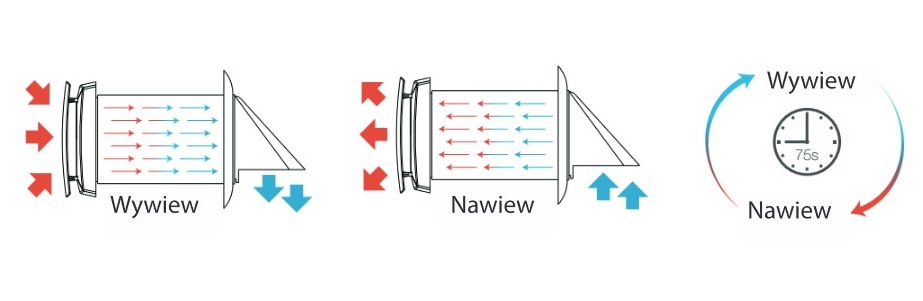 Po 75 sekundach wentylator ponownie się przełącza w tryb wywiewny i cykl się powtarza.