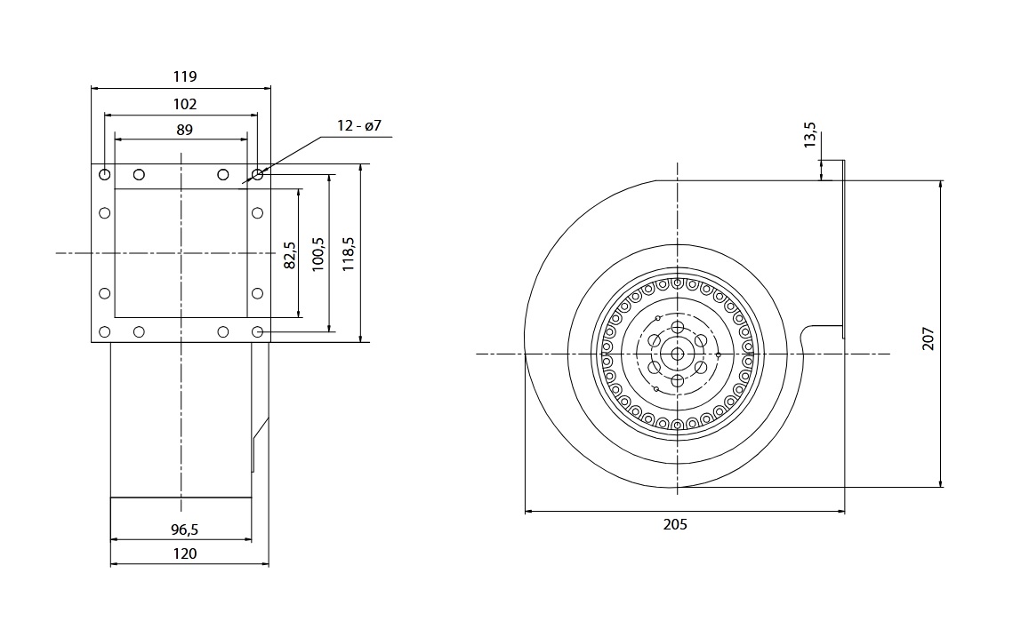 Wentylator promieniowy Ferono w którym przepływ powietrza jest prostopadły do osi wirnika. Powietrze przepływając przez wentylator promieniowy zmienia kierunek o 90°. W porównaniu do wentylatorów osiowych konstrukcje promieniowe charakteryzują się większym sprężem i wydajnością. Wentylator odśrodkowy promieniowy FERONO o jednym wlocie został wyposażony w łopatki zakrzywione do przodu. Dzięki nowoczesnej konstrukcji, wentylator osiąga wysokie ciśnienie i wydajność przy minimalnym poziomie hałasu.