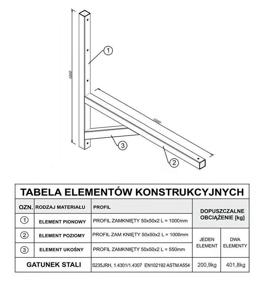 Wsporniki wykonane są z profili stalowych o konstrukcyjnej stali S235JRH. Spawane metodą MIG, korzystając z nowoczesnych maszyn tnących i spawalniczych, gwarantują precyzję i powtarzalność konstrukcji. Profile stalowe wsporników zabezpieczone są końcówkami plastikowymi przed wpływem warunków atmosferycznych.