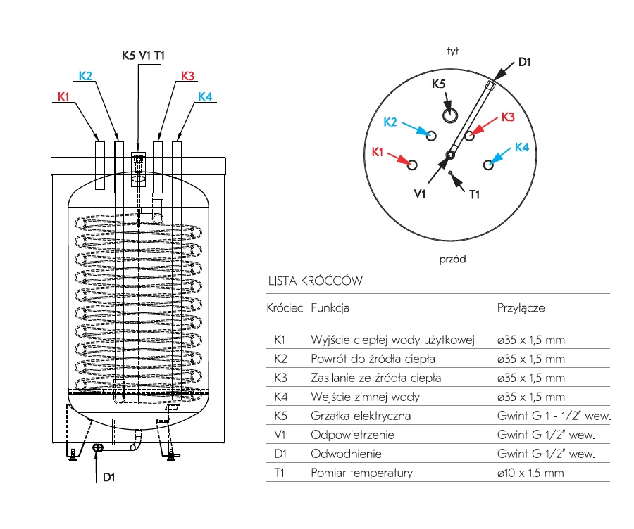 - Powierzchnia wężownicy: 2,5 m2